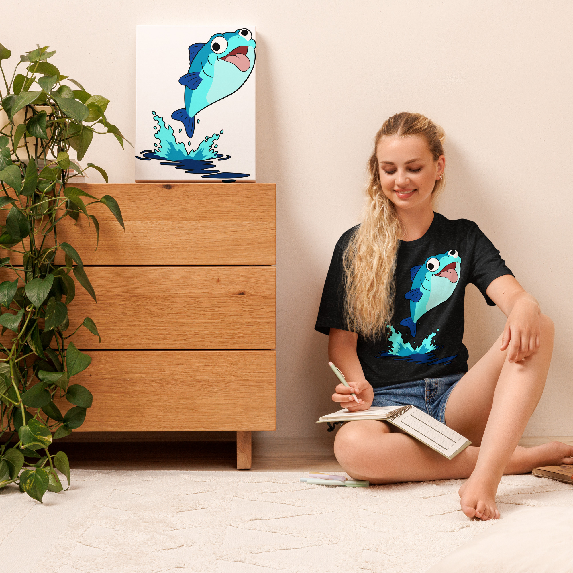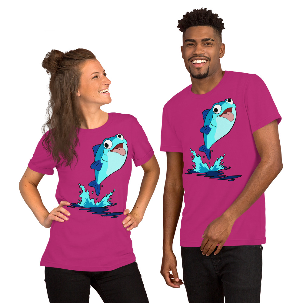 “Plenty o’ Da Fish In Seas” design by Kep Rinvelo features a derpy fish leaping from the sea, tongue hanging out, eyes not quite sure where to look – yeah, we feel that way a lot. This shirt variation features a blue fish.